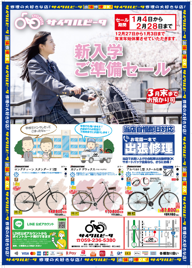 お買い上げの自転車につきましては、混雑時を除き18時までの依頼で当日中に引取後、修理完了お届けしています。(毎週水曜日と第3火曜日は定休日となります) |