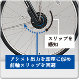 前輪モーターは、モーターブレーキだけでなく、マンホールやアスファルトのつなぎ目、小石や砂が集まりやすい道路など、路面の急な変化によって前輪が空転を感じた瞬間、アシストを抑えてスリップを回避します。