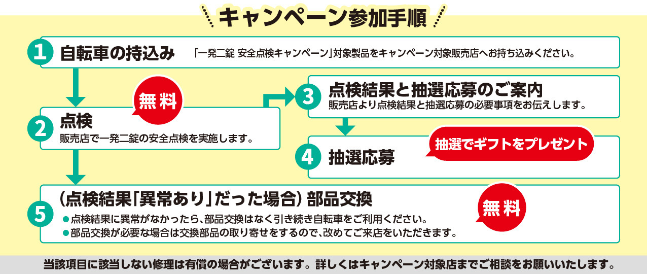 - 内容: キャンペーン対象販売店点検項目において、「一発二錠の重要点検項目」を無料で行います。点検の結果、該当項目に異常があった場合は、修理・部品交換等を無料で対応いたします。