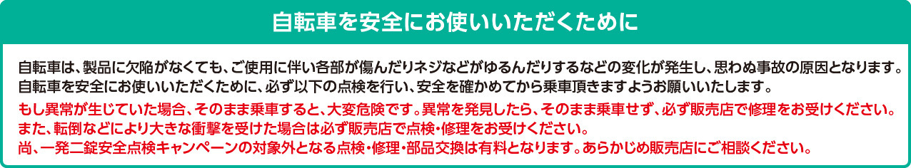 自転車は、製品に欠陥がなくても、ご使用に伴い各部が傷んだりネジなどがゆるんだりするなどの変化が発生し、思わぬ事故の原因となります。